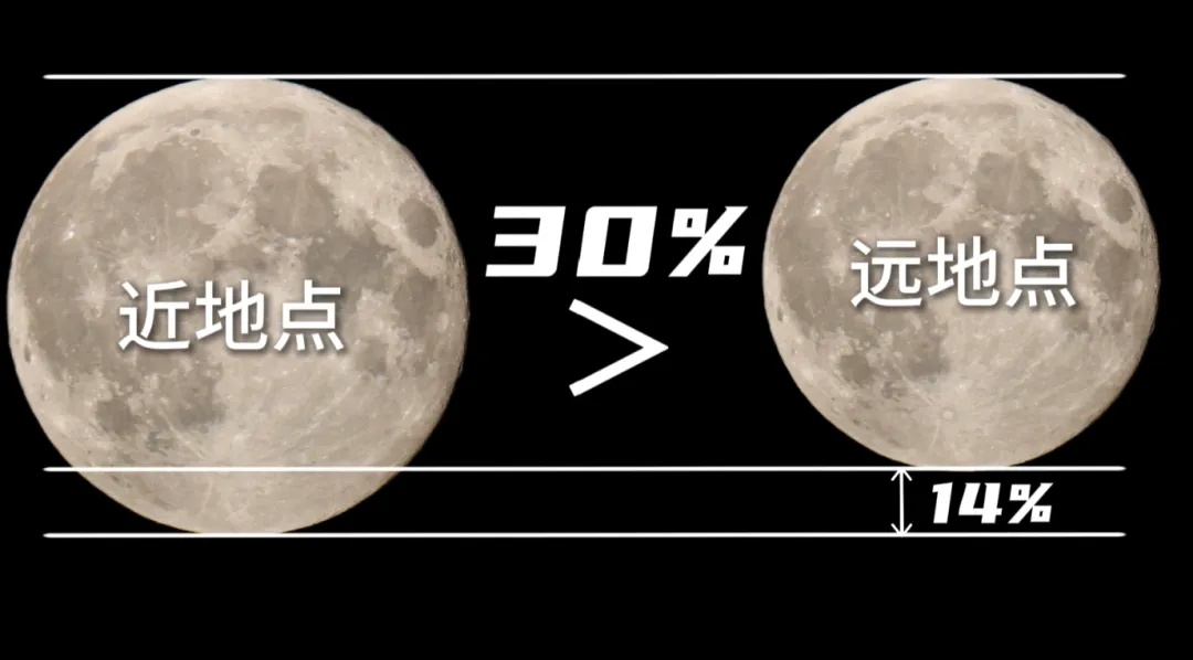 最大的圆月和最小的圆月从直径上看大小大概差了有14%,从面积上看大了30%。