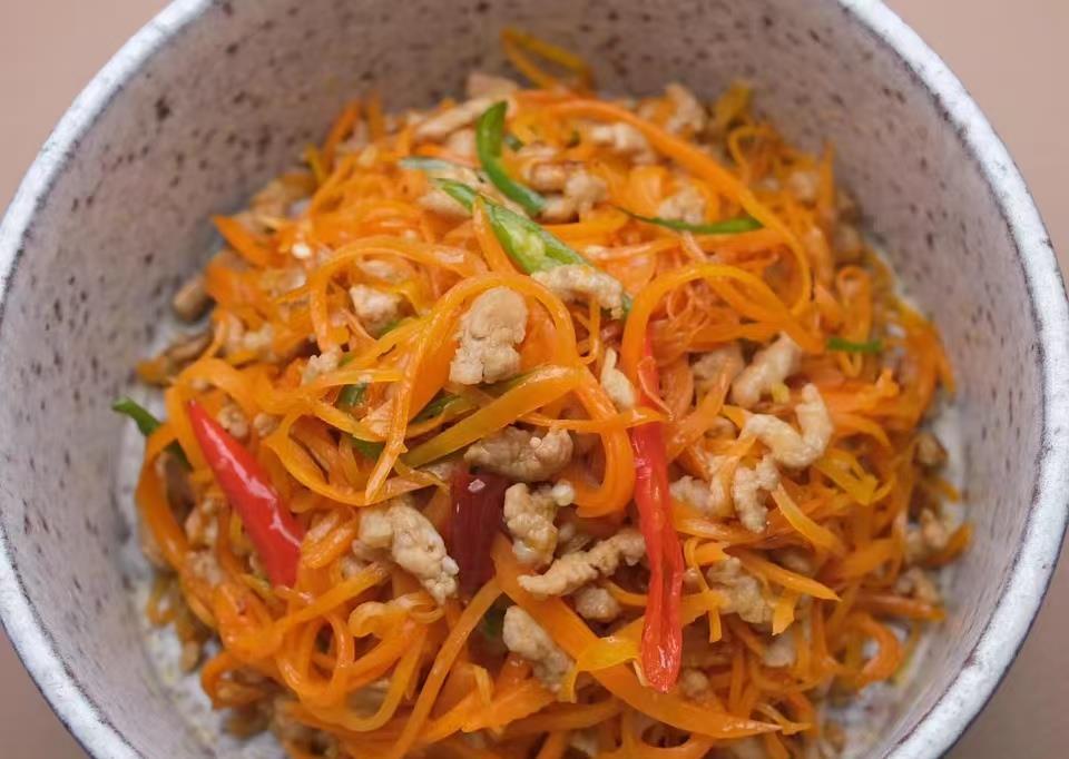 食材:肉末、胡萝卜、干辣椒、蒜、、盐、老抽、生抽