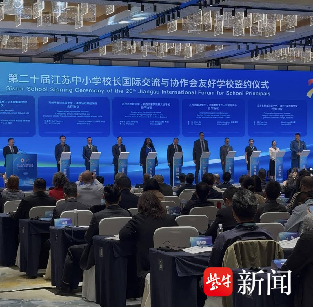 当数字时代的浪潮席卷全球,教育将如何回应“未来何为”的叩问?11月6日,第二十届江苏中小学校长国际交流与协作会在苏州开幕。这场为期两天的教育盛会,吸引了来自美国、英国、澳大利亚、加拿大、新加坡等16个国家的350余位教育界人士齐聚一堂,外宾覆盖国别数与参会规模均创历届新高。会议不仅聚焦“数字时代学生人工智能素养的核心构成与培养路径”这一前沿议题,更现场促成46对中外中小学缔结友好学校,为江苏教育的国际化版图再添浓墨重彩的一笔。自2005年创办以来,这一协作会已累计推动江苏中小学与国(境)外学校建立姊妹学校超过2000对,直接或间接促成5万余名师生开展双向交流。