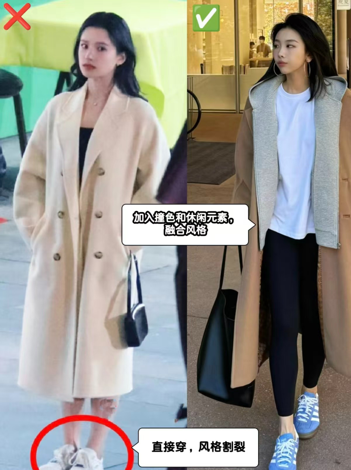 一定有姐妹要问了,明明打底裤和运动鞋都是平时经常穿的单品,怎么配上大衣就这么土呢?当然是因为这两个单品本身就有不少弊端,大衣会让人将视觉焦点放在衣服上,这就更放大它们的缺陷了。