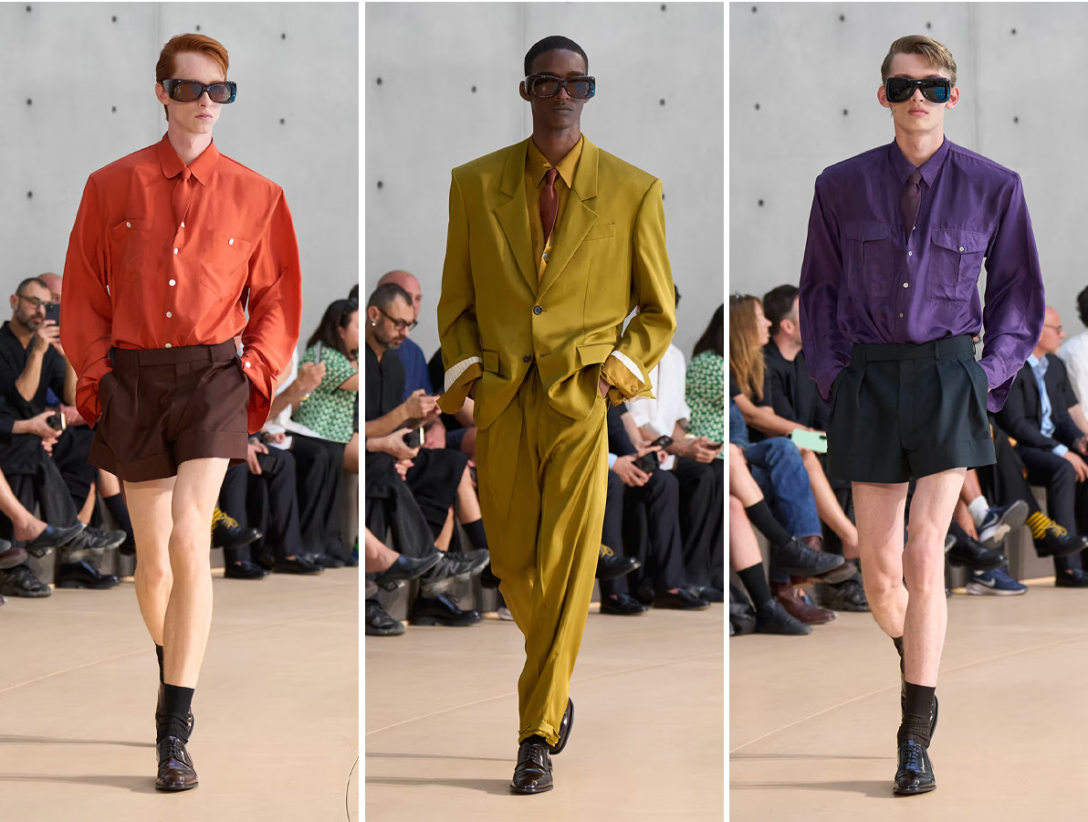 本季,普拉达打造了一个富有色彩张力的男装系列,既有大胆而清爽的糖果色,如苹果绿、金丝雀黄、西瓜红、绿松石蓝,也有婴儿粉、水绿、天空蓝等柔和轻盈的颜色。在这场名为“调性更迭”的时装大秀中,缤纷色彩象征自由与不羁,寓意一种灵活的心理状态,以此引领男士们摆脱束缚,步入充满崭新律动的新世界。