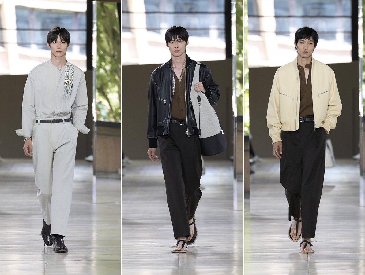 爱马仕(Hermes)本季男装追求一种轻盈自在感,无论从材质工艺还是廓形比例上,为低调随性的优雅男士打造现代都市衣橱。宽松裤装搭配短身夹克的组合比例恰到好处,舒适而不慵懒。而皮革这一品牌标志性元素在设计巧思和精湛工艺的配合间多了一份“呼吸感”——飞行员夹克、T恤和长裤等皮革单品融入镂空编织处理。本系列主要以牛皮纸色、石灰泥色、咖啡色、淡灰褐色等中性色为主,勃艮第红、香草色与薄荷绿色点睛其中。