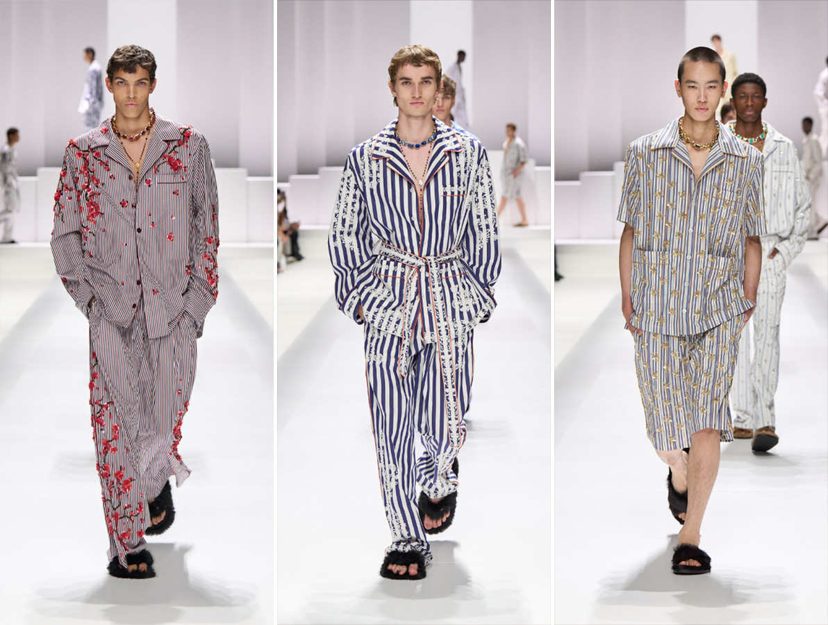 杜嘉班纳(Dolce & Gabbana)本季围绕“PYJAMA BOYS”主题,演绎了一场睡衣美学的风格革新,展现当代男性的松弛与自信。本系列作品将都市格调与度假风情着装巧妙融合,其中品牌标志性单品睡衣焕发新意,雅致色调与鲜明撞色和谐碰撞,轻盈棉质提花面料缀饰粗细各异的竖条纹图案,部分更有手工镶嵌的璀璨宝石及水晶刺绣织,让睡衣化身为华美且风格多元的新表达。