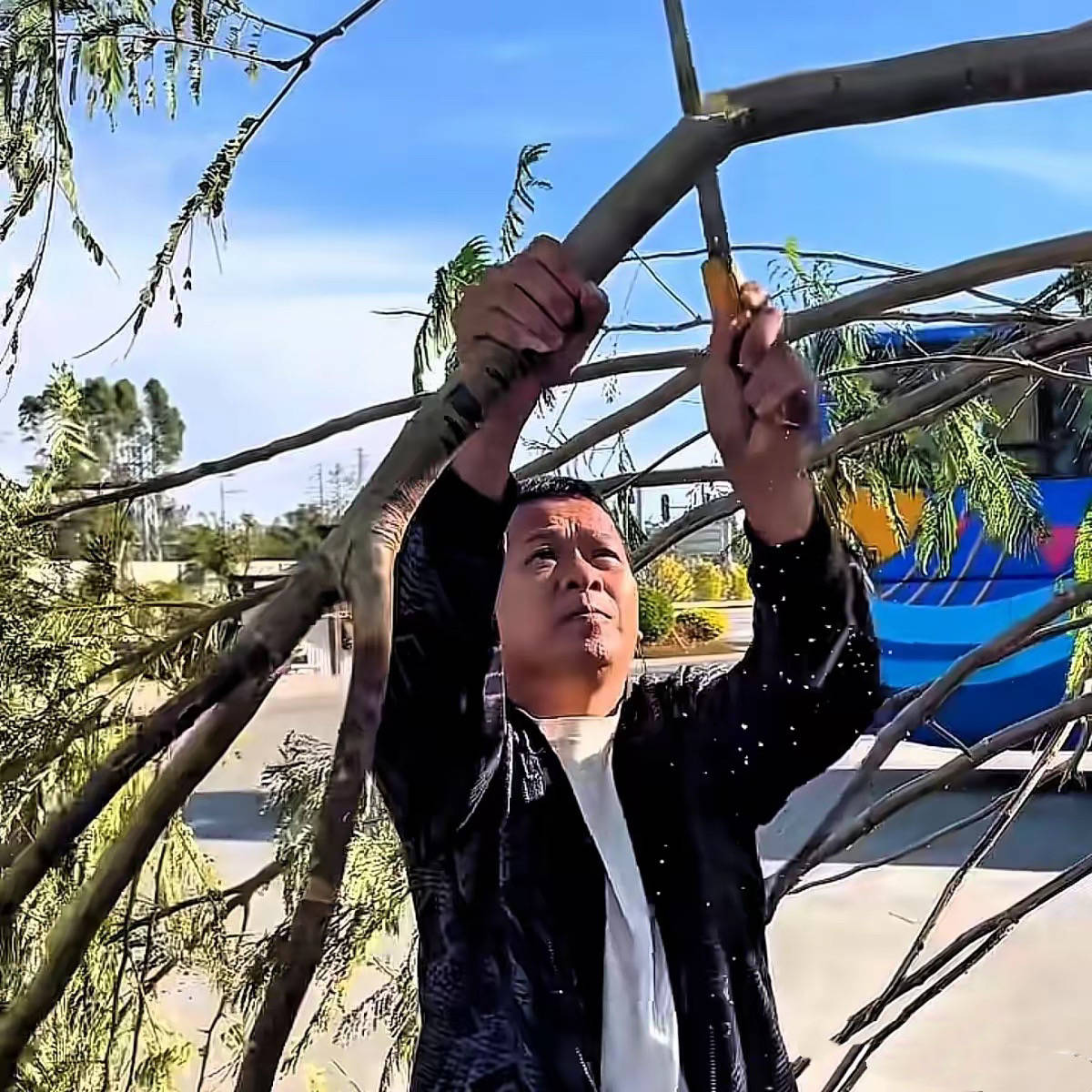 全爸爸认真的砍着树干,去掉凤凰树上的叶子。这样做是为了让凤凰树更好的存活,不然遇到大风天气也是会刮断树干。