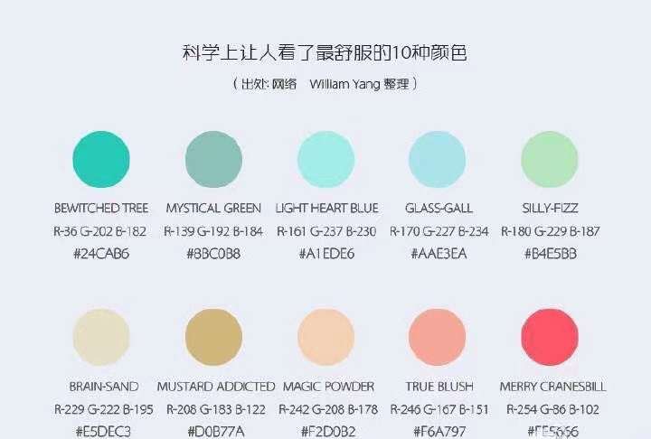 关于配色上,选择了时下流行的“糖果色”,而下图这十款配色据说是让人很舒服的糖果色,确实选择哪一个都不会显得突兀。