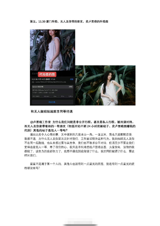 然而,如今她却因工作室的一系列争议事件被推到了风口浪尖。这场风波的导火索是一位名为“无人及你”的站姐的实名指控。这位站姐被曝长期与卢昱晓工作室私联,获取大量非公开行程信息,享受着其他站姐难以企及的特权。在追星的世界里,行程信息就如同宝藏地图,普通站姐往往只能通过路人偶遇等有限途径来得知偶像的动态,而“无人及你”却能直接与团队同乘车辆、同进同出,仿佛拥有了一张“VIP通行证”。