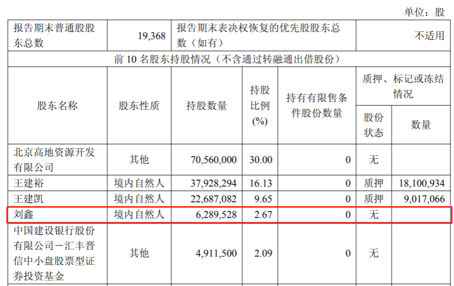 据查阅,大金重工第三季报显示,刘鑫为其第三大股东、第一大自然人股东,持股数量约为1226.51万股,持股比例约为1.92%。