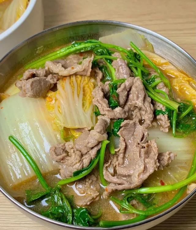 接下来,把娃娃菜扔进去煮个两分钟,然后把腌好的牛肉放进来,让它们一起热个透!