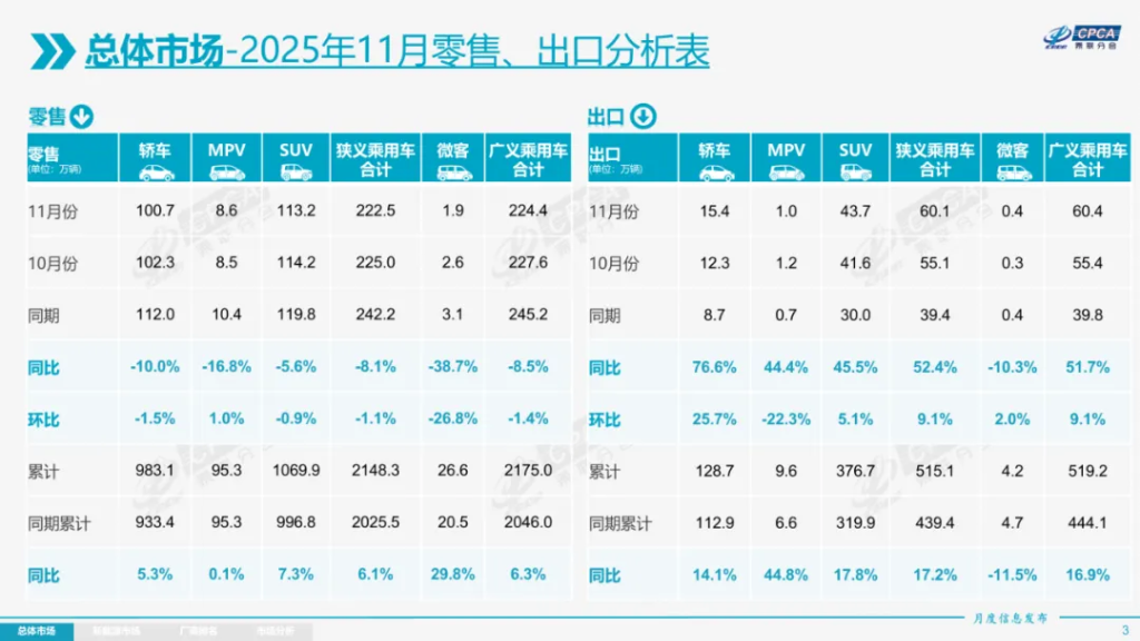 在国内市场承压之际,出口成为亮点。11月整体汽车出口增长飙升至52.4%,远高于10月的27.7%。