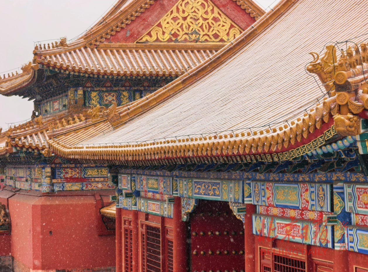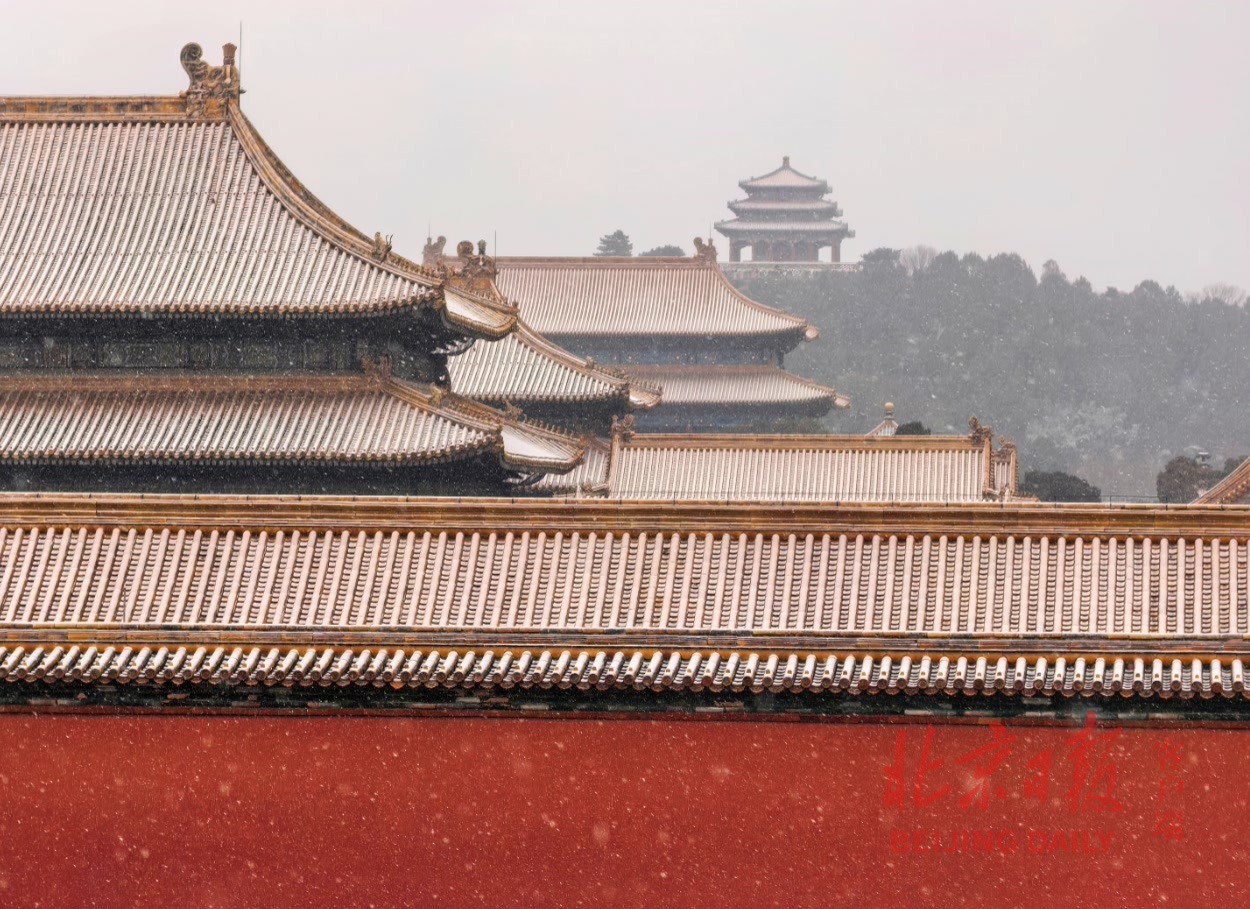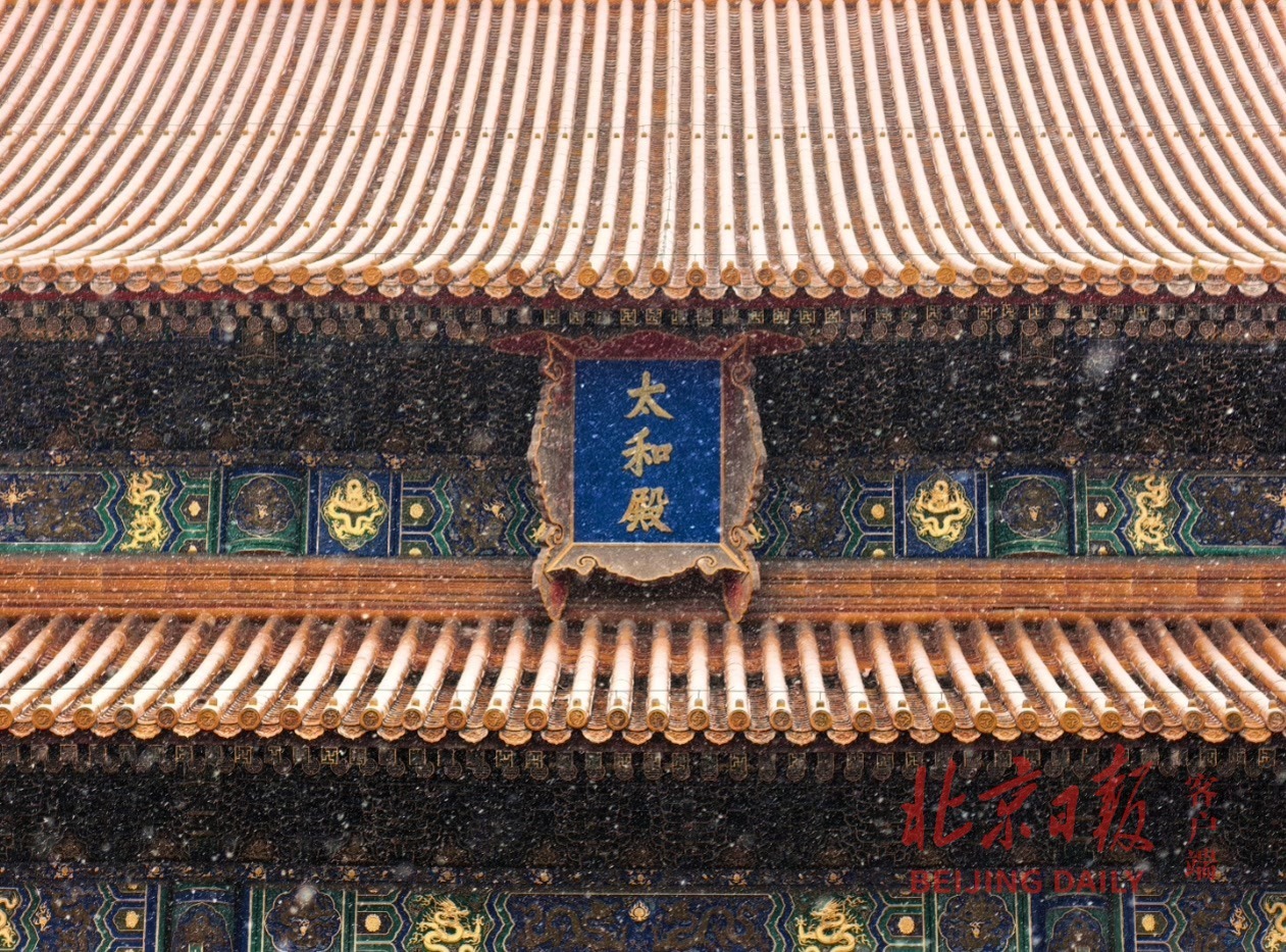 雪花落到紫禁城,自带背景音,淋漓尽致地展现中式浪漫。朱红色的宫墙、金色琉璃瓦……纷纷洒洒的白雪给饱和度高的紫禁城加了一层天然滤镜,为严肃的大殿添了一抹温度。