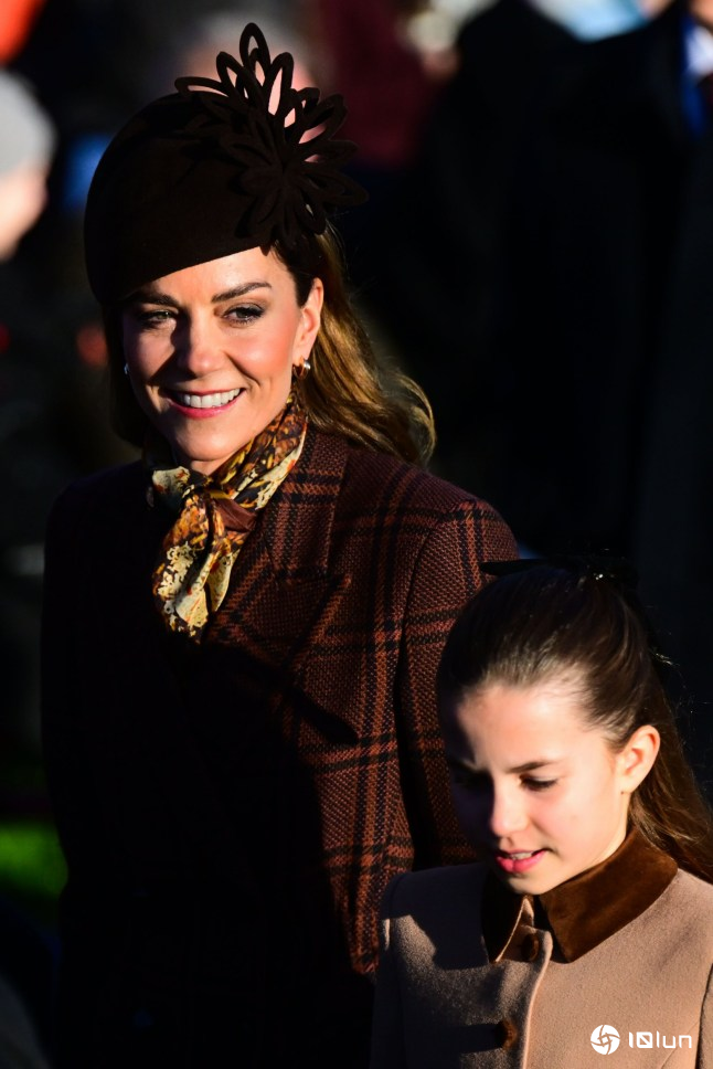威尔士王妃为此选择了一件温暖棕色的格子大衣,并搭配同色系的朱丽叶·博特利帽、卡地亚三叶耳环,以及一条看起来与她2014年圣诞节当天佩戴的丝巾相同的围巾。