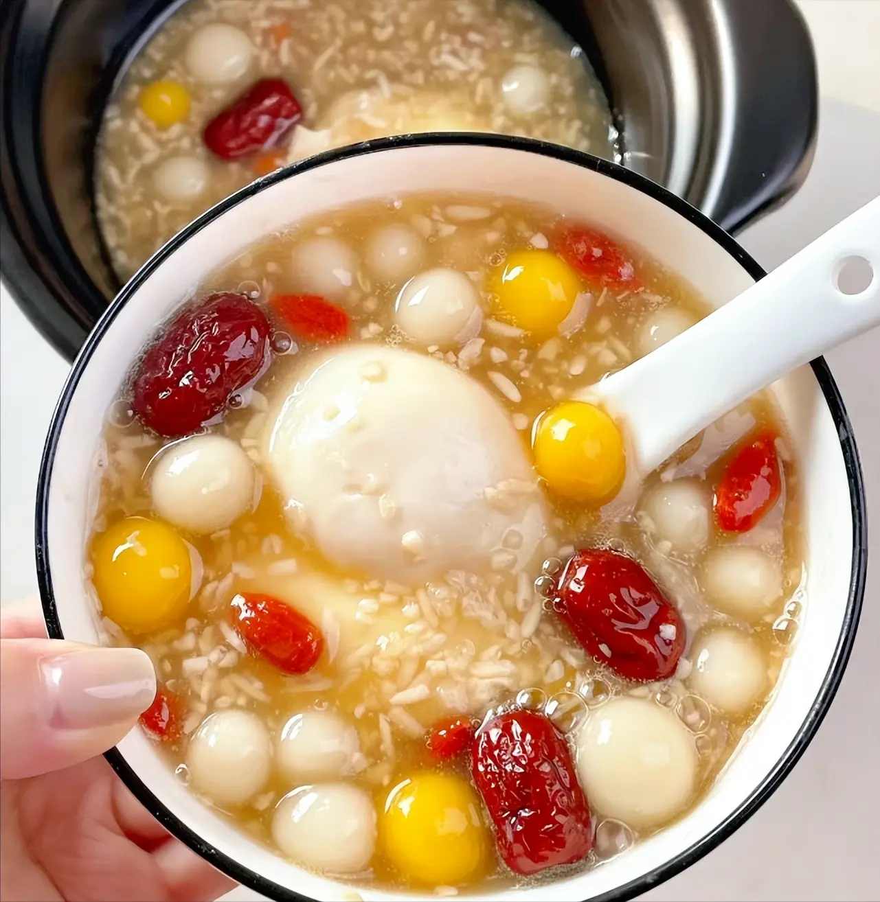 这里的“一白一红”指的是红枣和酒酿,红枣营养丰富,女人多吃可以补气血,搭配上驱寒滋补的甜酒酿一起,对女人更友好了,暖身补气血女人气色红润。搭配上糯米小丸子一起煮糖水,好吃解馋又营养,女人别错过哦。