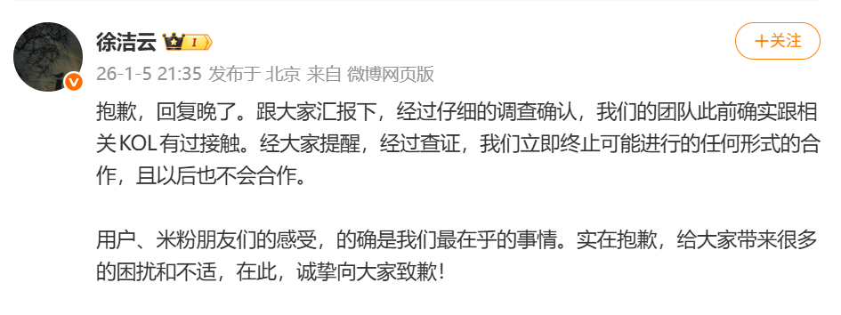 DoNews1月5日消息,小米新任公关部总经理徐洁云今日发文致歉:“经过仔细的调查确认,我们的团队此前确实跟相关 KOL 有过接触。经大家提醒,经过查证,我们立即终止可能进行的任何形式的合作,且以后也不会合作。”