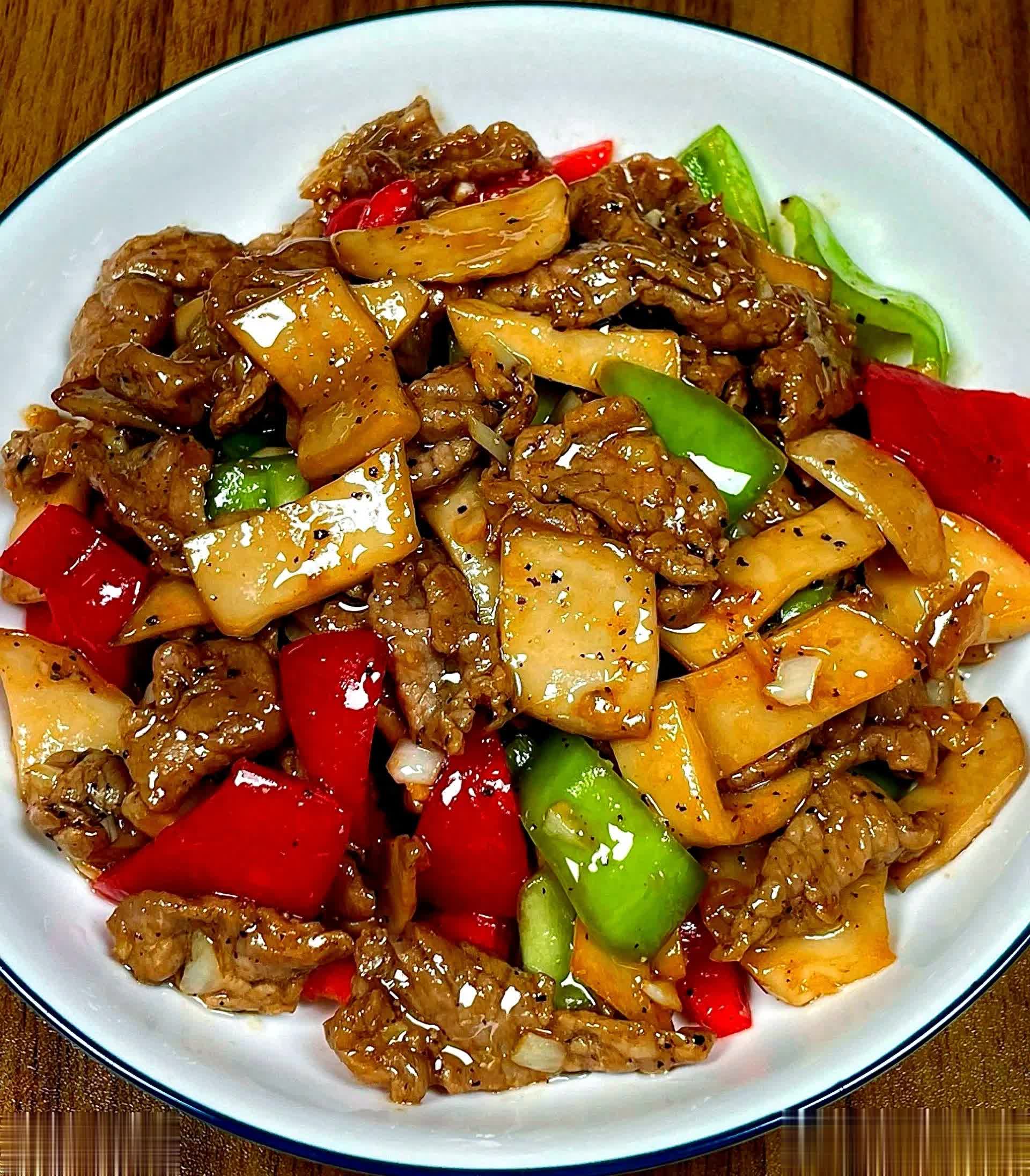食材: 牛里脊、杏鲍菇、青红椒、蒜、生抽、老抽、淀粉