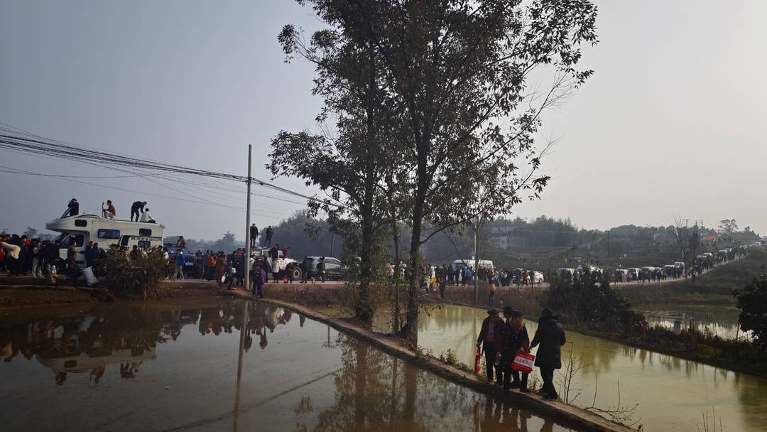 当清晨的薄雾还未散尽时,村道旁已经停满了挂着各地号牌的车辆。狭窄的车道迫使封面新闻记者在距离目的地还有3公里时,只能停车步行前往。