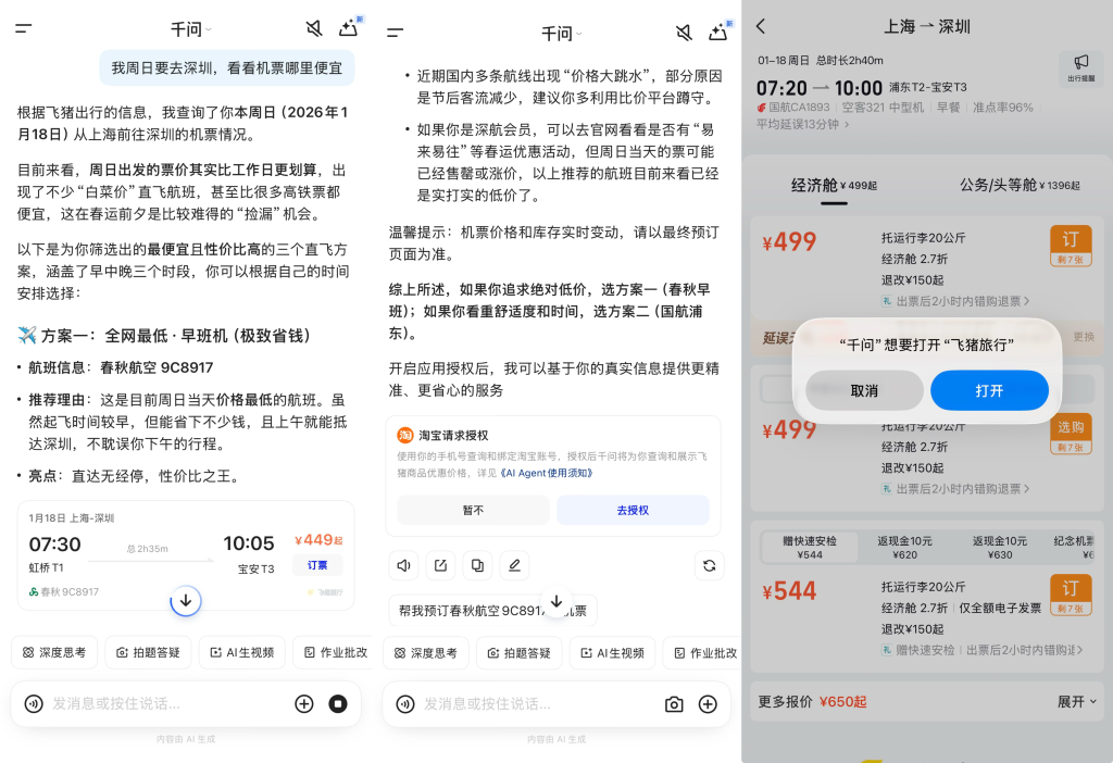 1月15日,澎湃新闻记者实测发现,在千问APP中,用户通过授权绑定淘宝闪购账号后,能根据推荐选择下单。在出行方面,能通过跳转到飞猪APP进行预定机票操作。