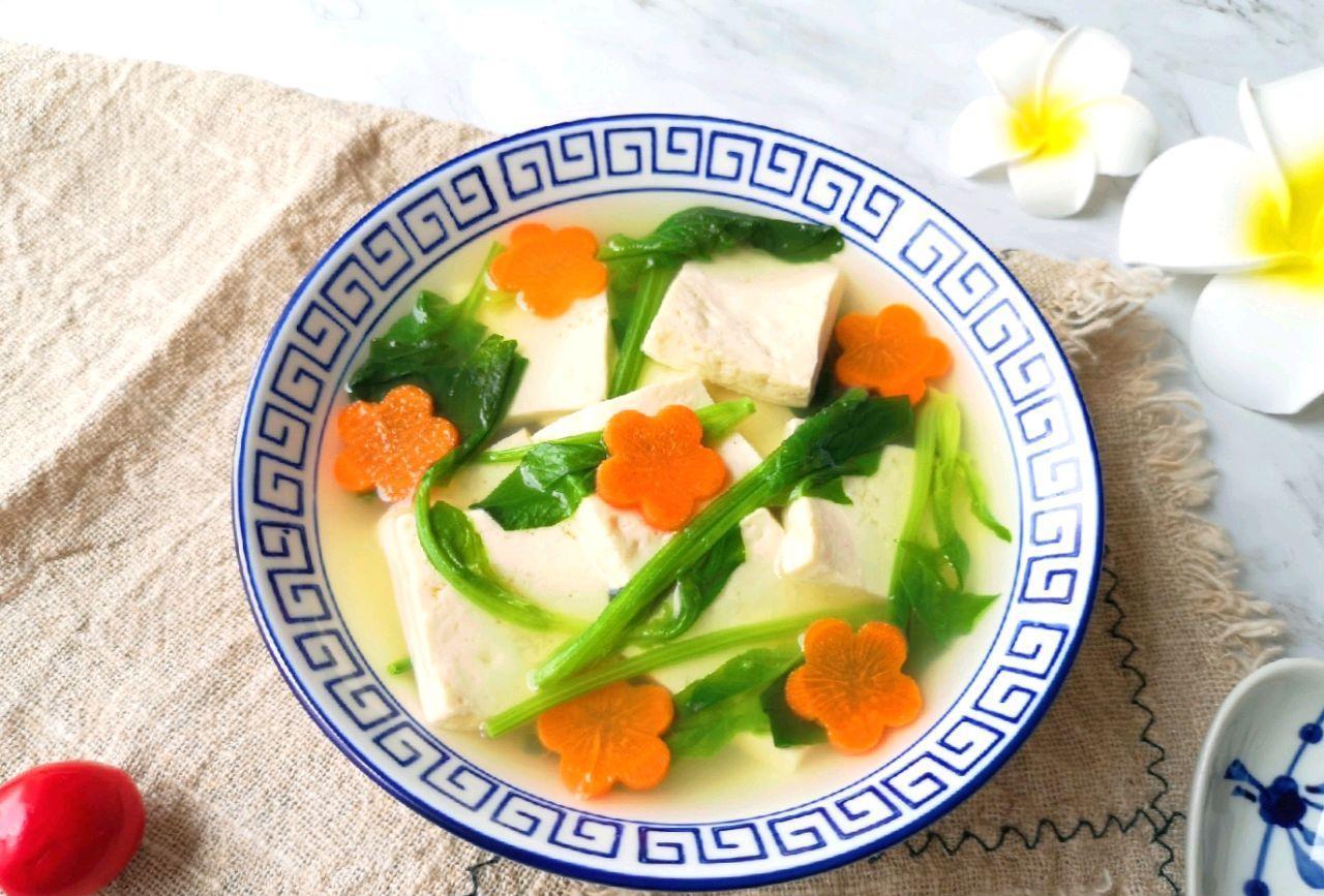 主要食材:豆腐、菠菜、大蒜、鸡汤或清水、盐。