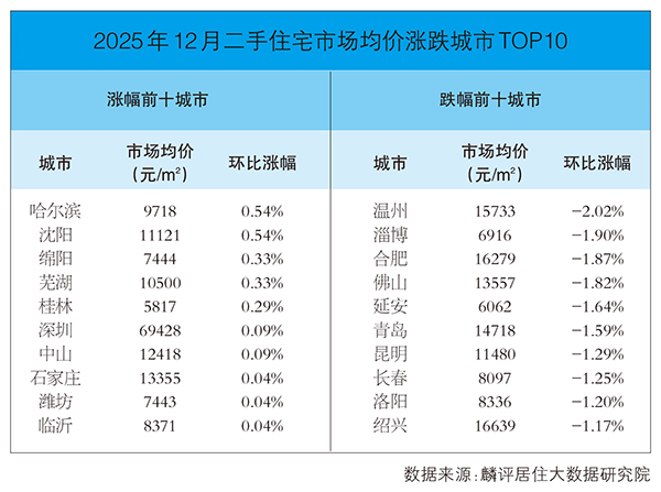 报告显示,哈尔滨和沈阳位居12月二手住宅价格环比涨幅前列,涨幅均为0.54%;绵阳、芜湖和桂林紧随其后,涨幅分别为0.33%、0.33%和0.29%;深圳、中山、石家庄、潍坊和临沂五个城市涨处于0.04%到0.09%之间。