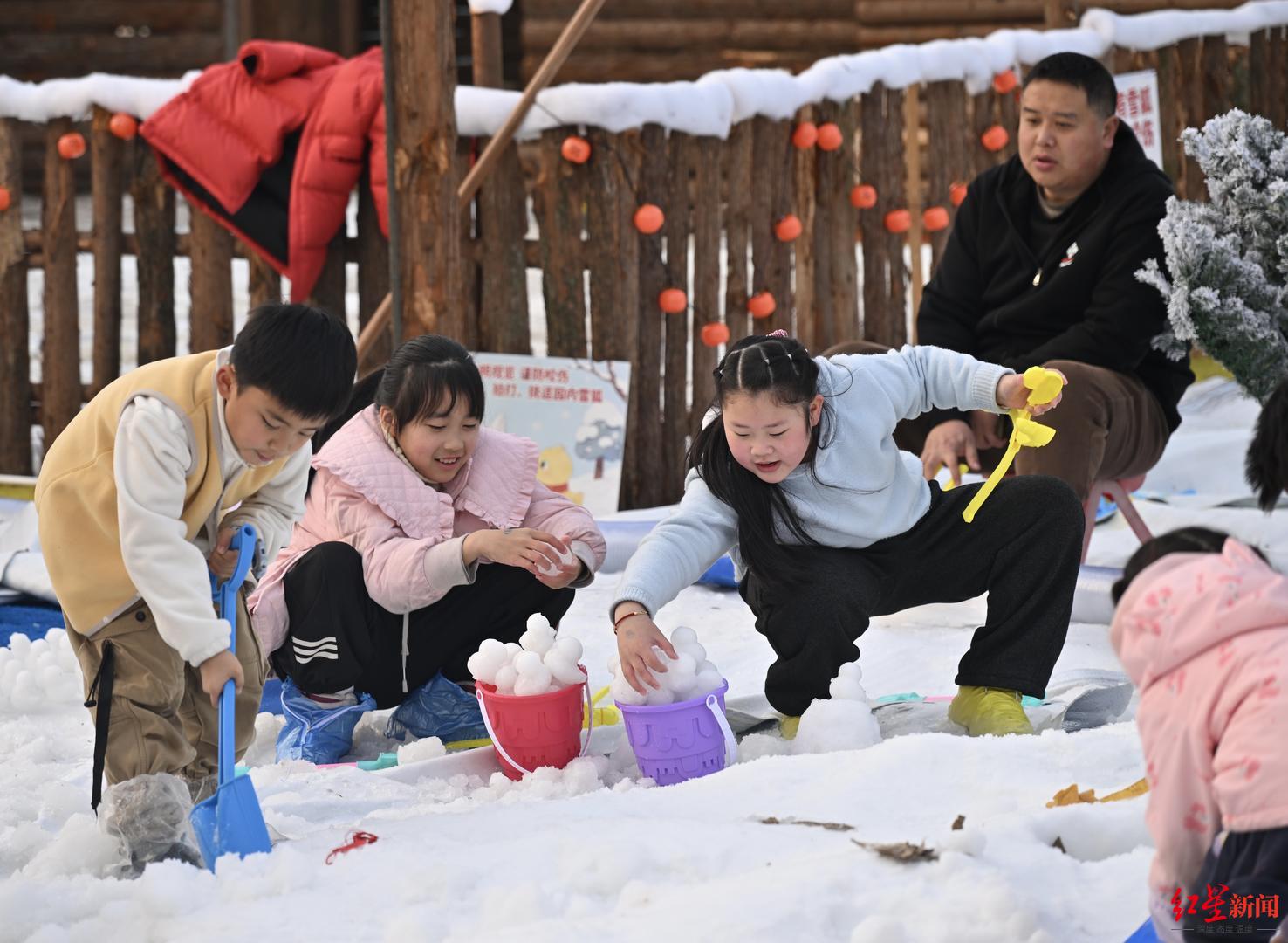 记者在现场看到,目之所及都是皑皑“白雪”,35座阿勒泰同款小木屋点缀两旁,还有来自哈尔滨同款雪狐,显得俏皮可爱。现场的游客既可以用工具制作小黄鸭雪球,也可以坐雪橇。