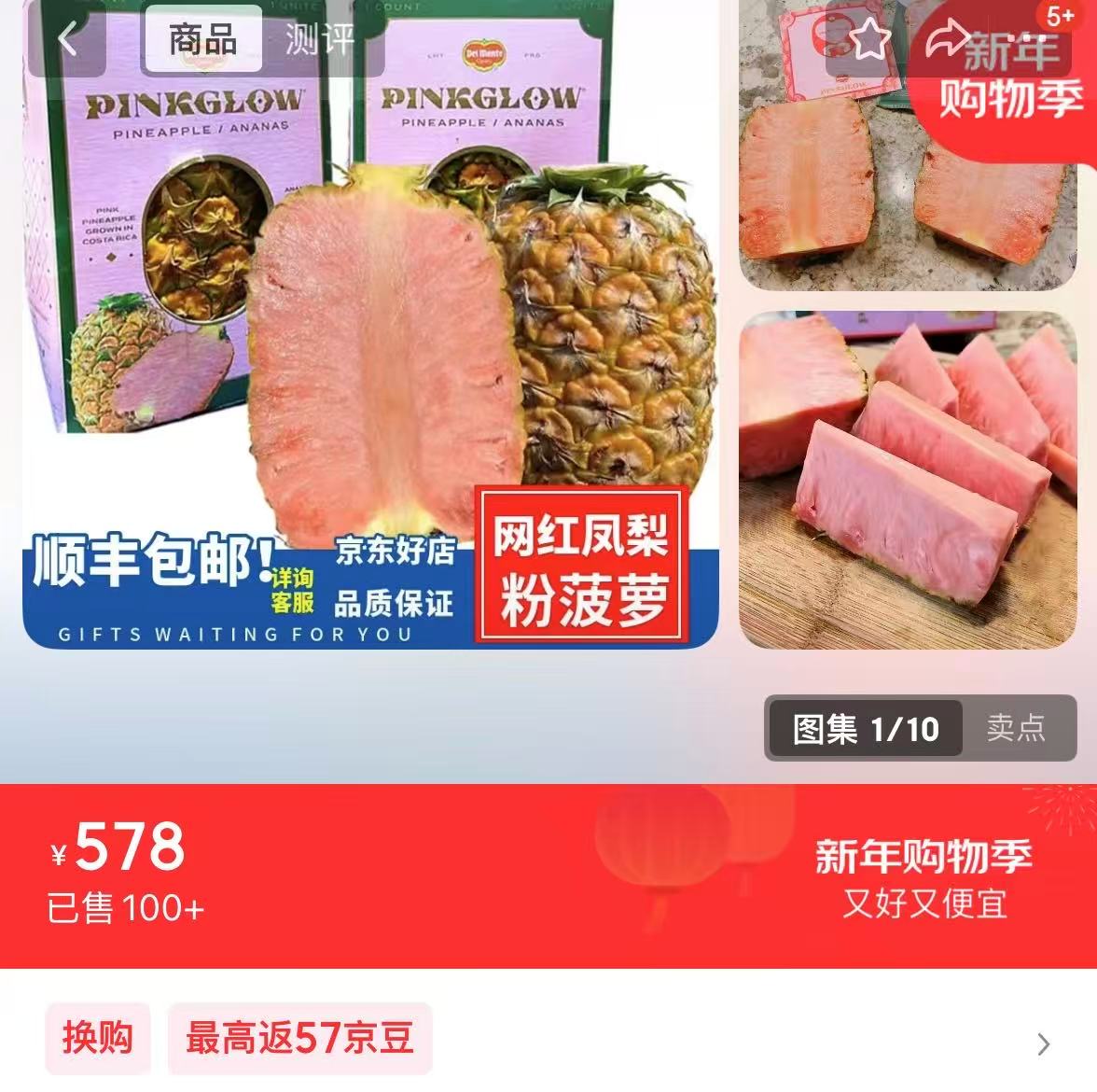 界面新闻记者在某电商平台搜索发现,有多个商家在售这种粉菠萝,价格在近600元到1000元价格不等。其中,一家店铺在售3到4斤一个的售价578元,显示已售100+,有评论称“汁水多、很甜”。另外,多家店面显示北京地区当日达。