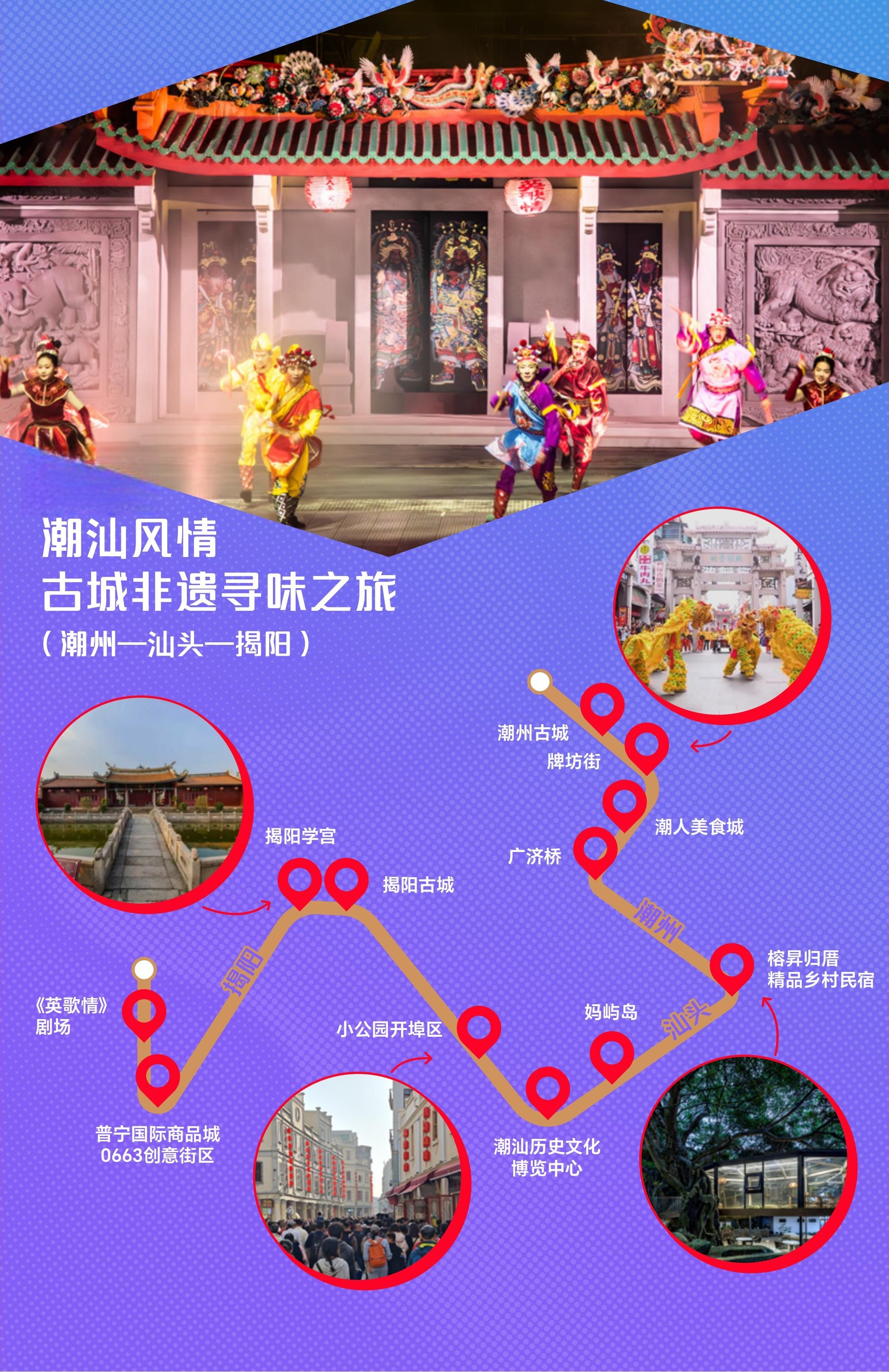 揭阳:探访揭阳古城,游览揭阳学宫;在普宁国际商品城0663创意街区感受商贸活力;夜晚体验《英歌情》剧场沉浸式精彩演出。