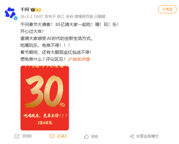 日前,千问APP宣布将投入30亿元启动“春节请客计划”,以免单形式请全国人民在春节期间吃喝玩乐,感受AI时代的全新生活方式。