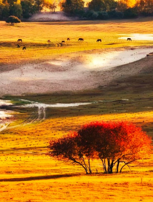 乌兰布统草原兼具南秀北雄之美,丘陵与平原交错,森林与草原有机结合。秋日的草原最为迷人,金色草场如油彩画般绚烂,万马奔腾的场面气势恢宏,悠扬的马头琴声回荡在天地间。独特的地貌让这里成为摄影天堂,每一处光影都能定格成绝美的画面。