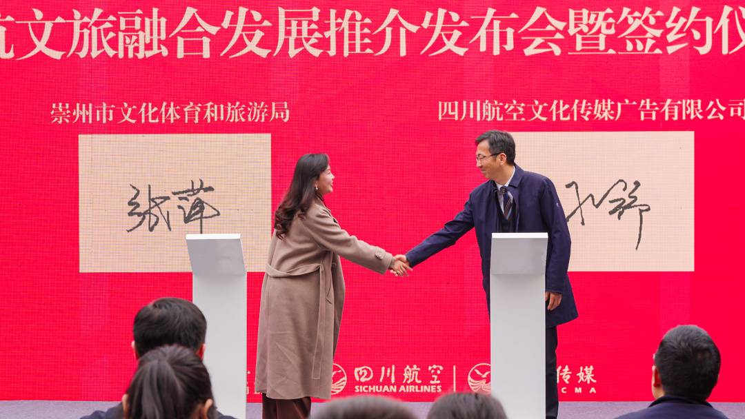 签约仪式上,崇州文旅推介官向全场详细发布了本次战略合作的核心内容。按照计划,双方将共同设计并推出“云端非遗”系列主题航班,全面植入罨画池园林、非遗技艺、陆游诗词等崇州文化元素,打造头片、小桌板、行李架贴图等视觉系统。机上视听娱乐系统将开辟“崇州频道”,播放非遗纪录片、古镇风光片及文旅导览内容。在部分精品航线上推出“空中非遗体验包”,内置微型竹编或藤编材料,旅客可于航程中亲手体验最简单的编织技艺,让飞行时间转化为充满趣味的文化学习时刻。