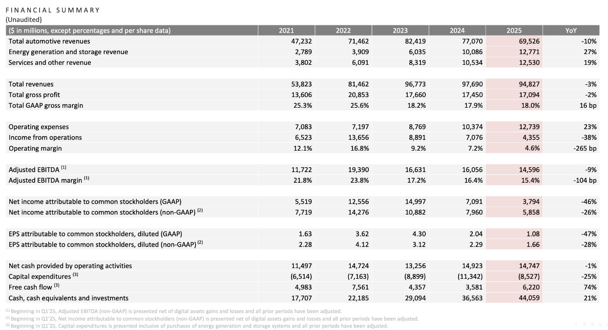 停产决定的背后,是特斯拉正面临的严峻现实。其2025年全年营收948.27亿美元,同比下滑3%,为公司史上首次年度营收下滑;净利润37.94亿美元,同比暴跌46%;全球交付量163.6万辆,同比下降8.6%,首次被比亚迪以225.7万辆的纯电销量超越,失去了全球最畅销电动车企业的桂冠。