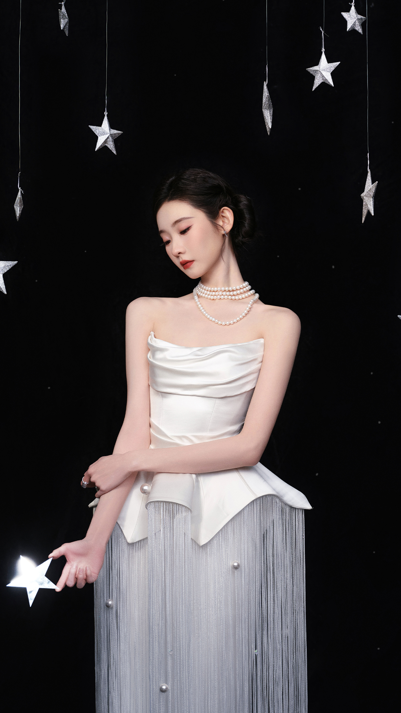 姐妹们,快扶我一把!刚刷到张艺凡的最新大片,差点以为手机屏幕里走出了一位深夜来访的精灵公主。她身穿一袭白色流苏礼服,那可不是普通的白——是那种在灯光下会微微泛光、仿佛被月光亲吻过的缎面白!流苏随着她的动作轻轻摇曳,每一步都像踩在云朵上,优雅得让人想屏住呼吸。