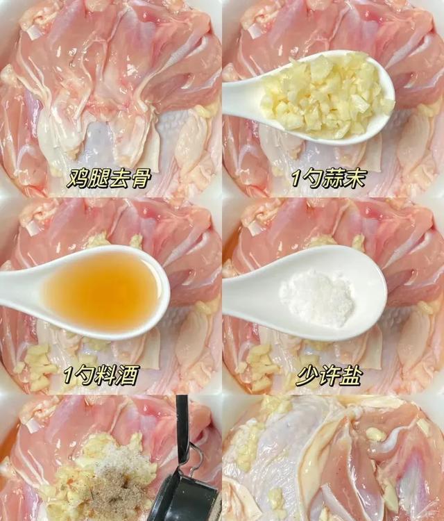 第一步:鸡腿去骨,加1勺蒜末,1勺料酒,少许盐,少许胡椒粉,抓匀腌制30分钟!