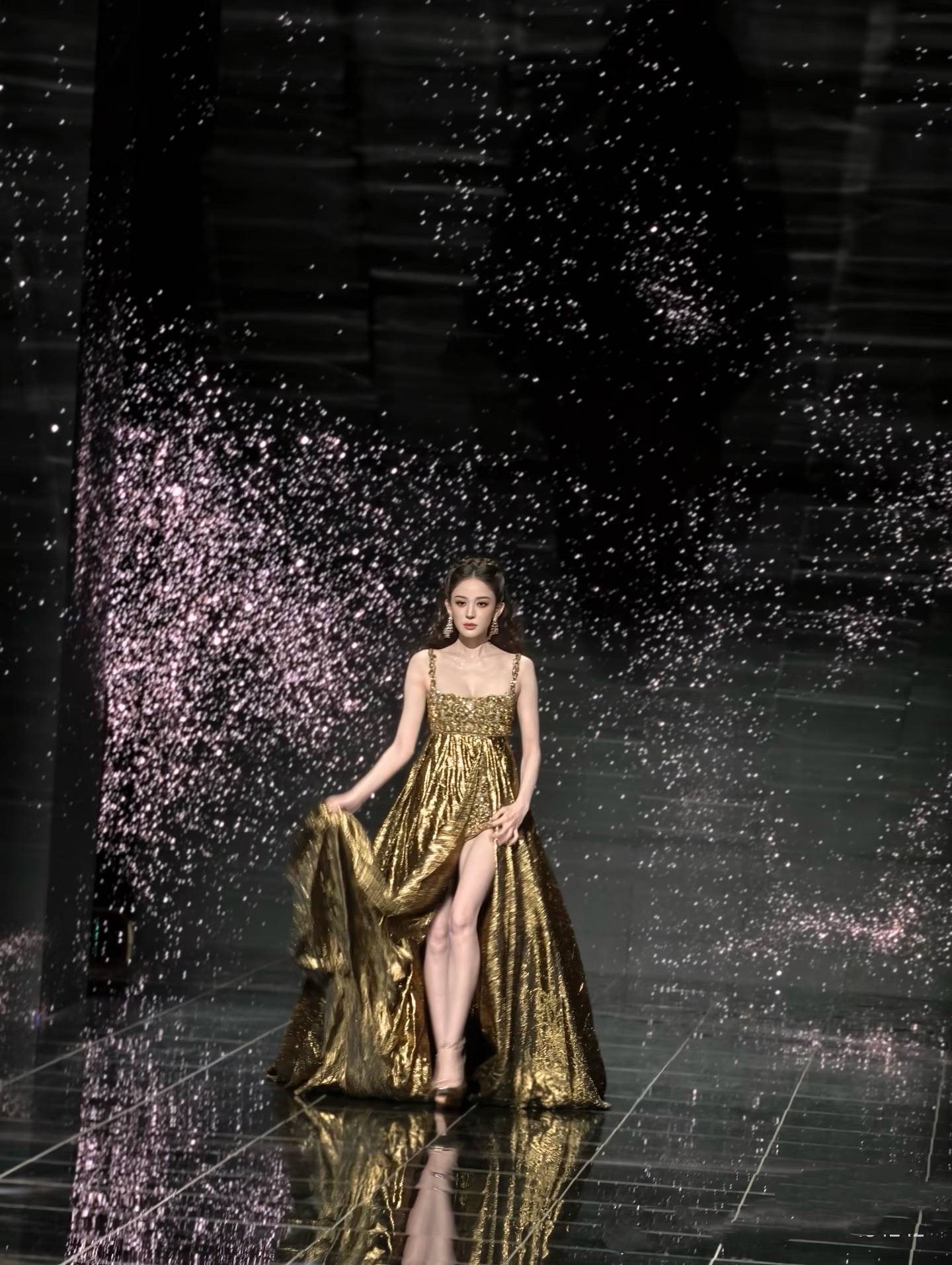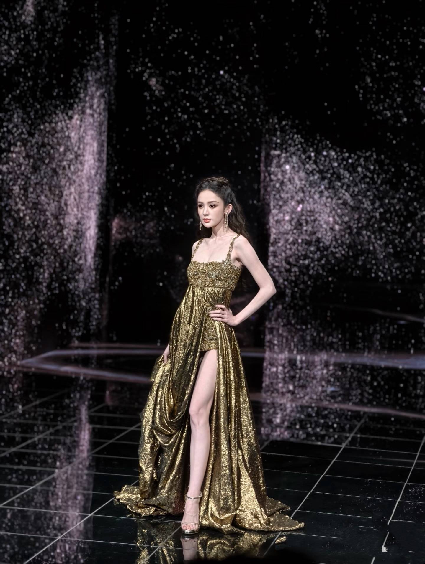 古力娜扎穿着金色高开叉长裙,微卷的半扎发像花仙子一样,是那种很时髦醒目的美。