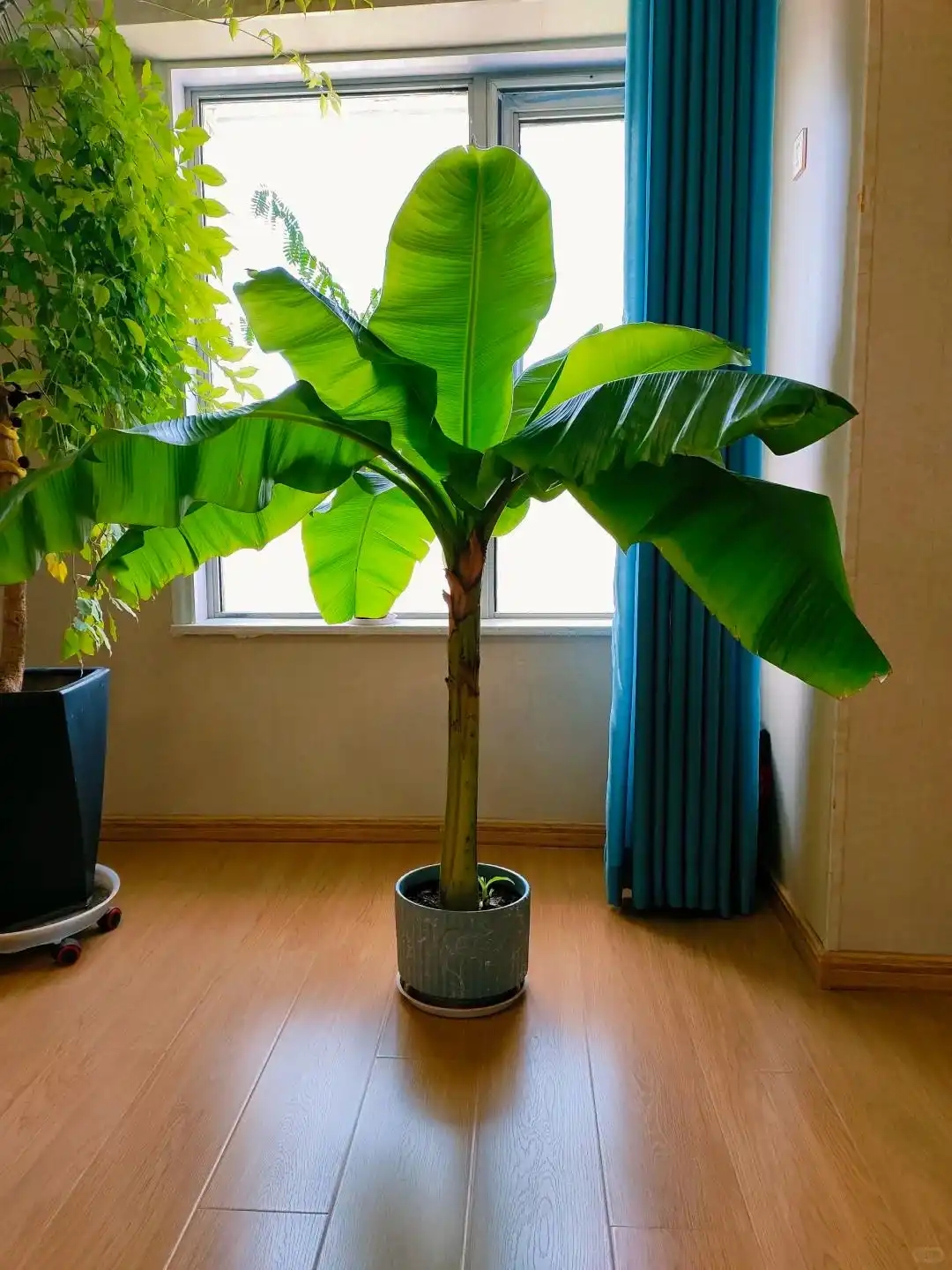 你千万不要指望它结大大小小的香蕉果实,因为,屋里温度、湿度、光线都不一定能适应热带果树,结果也不一定会好,养成一棵翠绿的“大叶王”,都比追求结果,都有成就感。