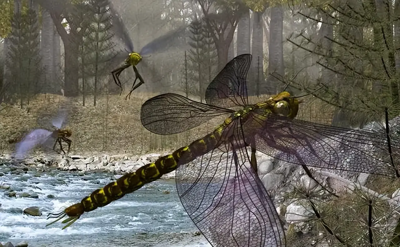 氧气多了以后,很多生物也变大了。比如有翼展超过70厘米的巨型蜻蜓,还有两三米长的千足虫,这都是我们今天难以想象的尺寸。