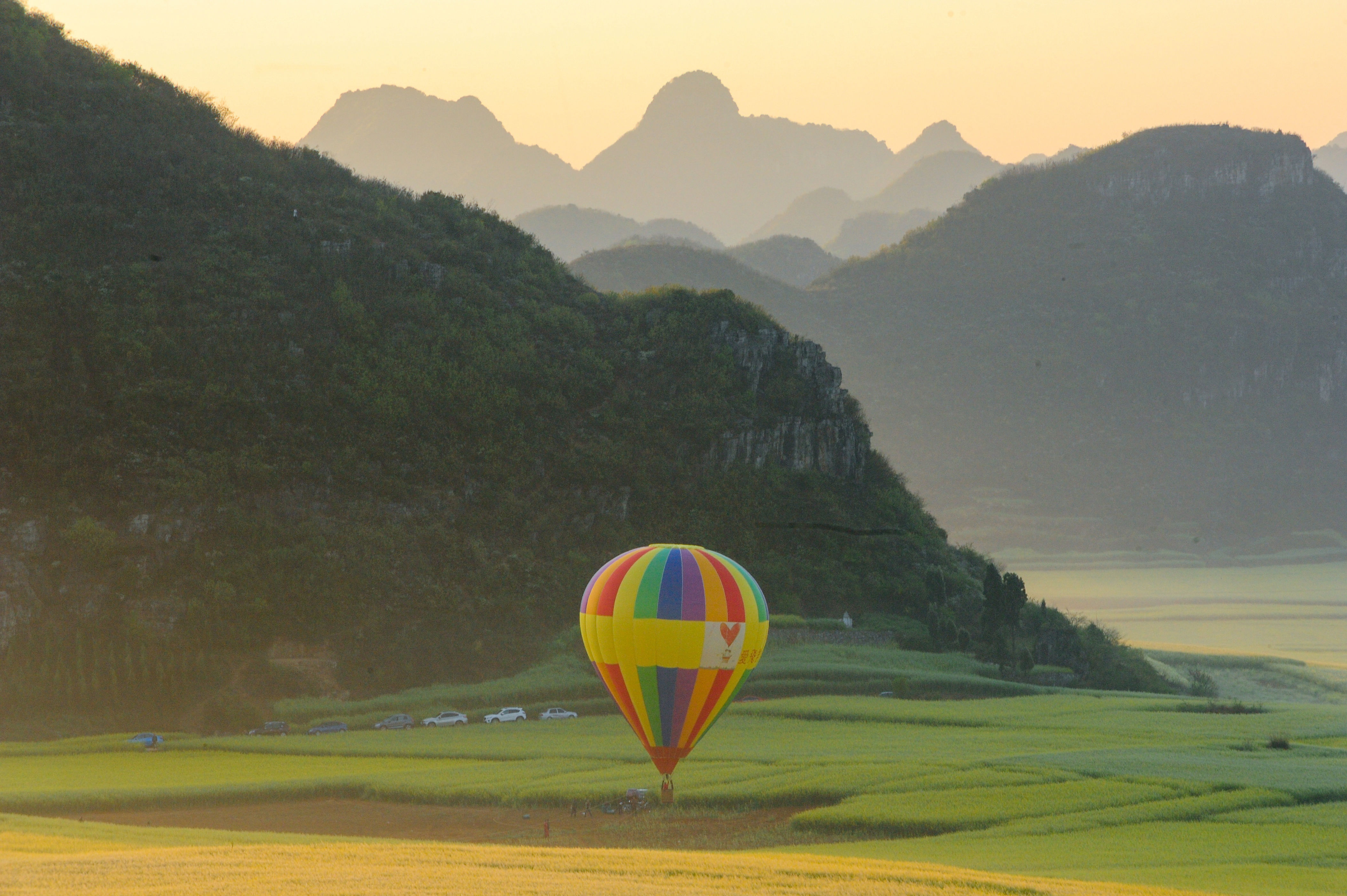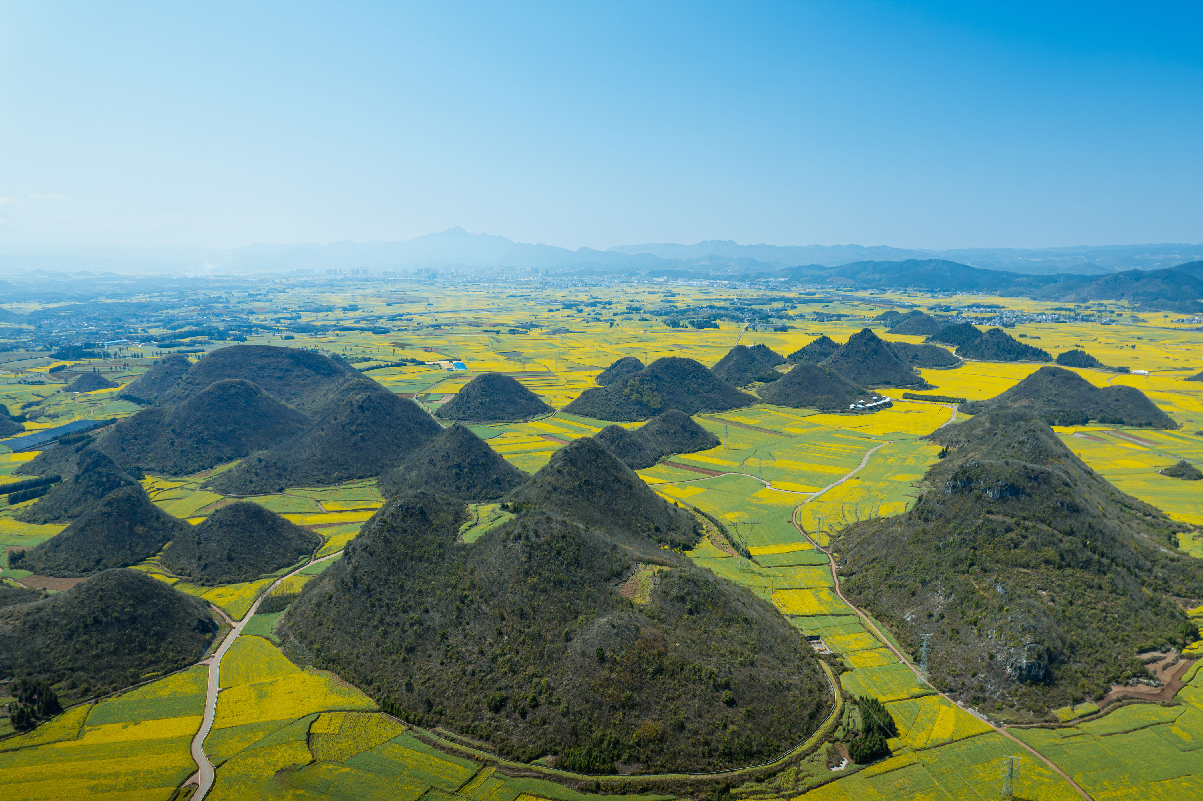 金鸡峰丛,峰林峰从连城片,每年花期的时候,漫山遍野的油菜花,如画的田园风光,勾勒出一幅幅天然画卷。登上观景台,可以看到一望无际的金色海洋,绵延起伏的山丘点缀在油菜花海中,映入眼帘的金黄色花海,美得令人窒息。