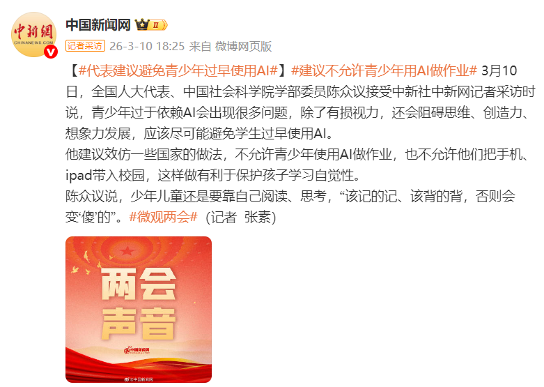 3月10日,全国人大代表、中国社会科学院学部委员陈众议接受中新社中新网记者采访时说,青少年过于依赖AI会出现很多问题,除了有损视力,还会阻碍思维、创造力、想象力发展,应该尽可能避免学生过早使用AI。
