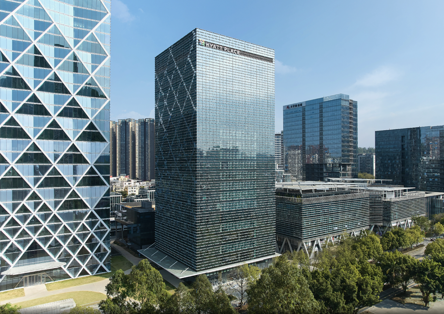 同时,酒店毗邻深圳国际大学园,与园区内配备专属停机坪的超高层地标写字楼——天安中心共同构成综合体核心配套。