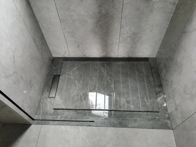 简单来说,就是给淋浴区地面整铺一块石材,并给石材做拉槽处理(防滑),以及四周留一圈下沉式排水槽。
