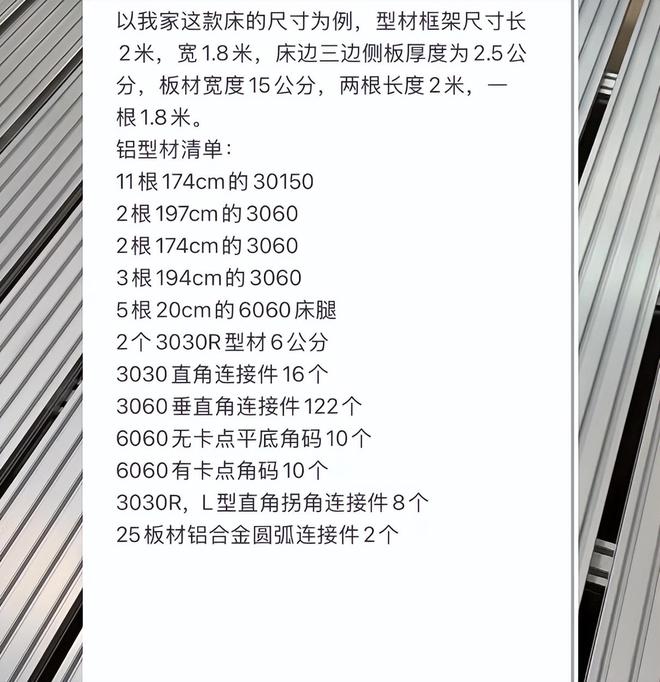 网友@陈陈同学就用铝型材自己手搓了一张2X1.8m的悬浮床,所有材料自己定制,成本大概2000出头。