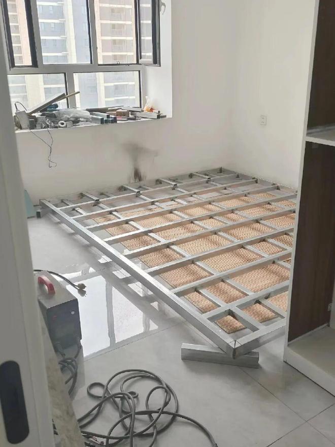 网友@田小二的做法就很不错,直接用方钢焊了一张长2.6m,宽2.1m的地台床,而成本仅花了200块。