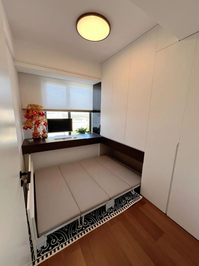 所以,对于偶尔有留宿需求的家庭来说,可以选择抽拉式折叠床,所占用空间只有墨菲床的一半。