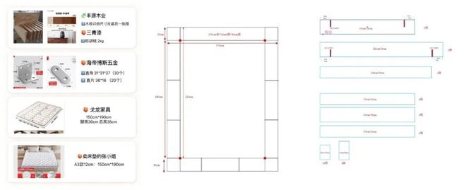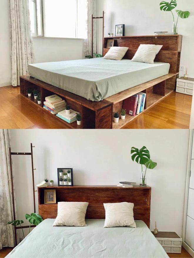 木板可以计算好尺寸,网上或线下定制,回来后自己刷一遍木蜡油,然后用连接件固定起来;床头是由两组柜子拼起来了。