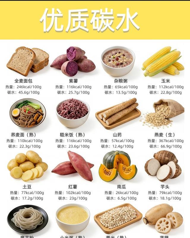- 注意:燕麦(生)碳水含量高但膳食纤维丰富,建议煮后食用,避免过量;全荞麦面、杂粮粥也是很好的复合碳水选择。