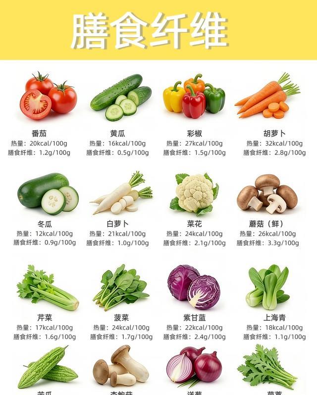 膳食纤维是肠道的“清道夫”,还能延缓糖分吸收,图里的蔬菜都是低热量、高纤维的代表: