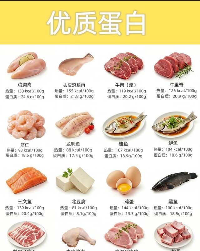 - 动物蛋白首选:鸡胸肉(24.6g/100g)、瘦牛肉、牛里脊、瘦羊肉,热量低、蛋白含量高,适合减脂期;鱼虾类(虾仁、鲈鱼、桂鱼)和去皮禽肉也很友好,脂肪更低。