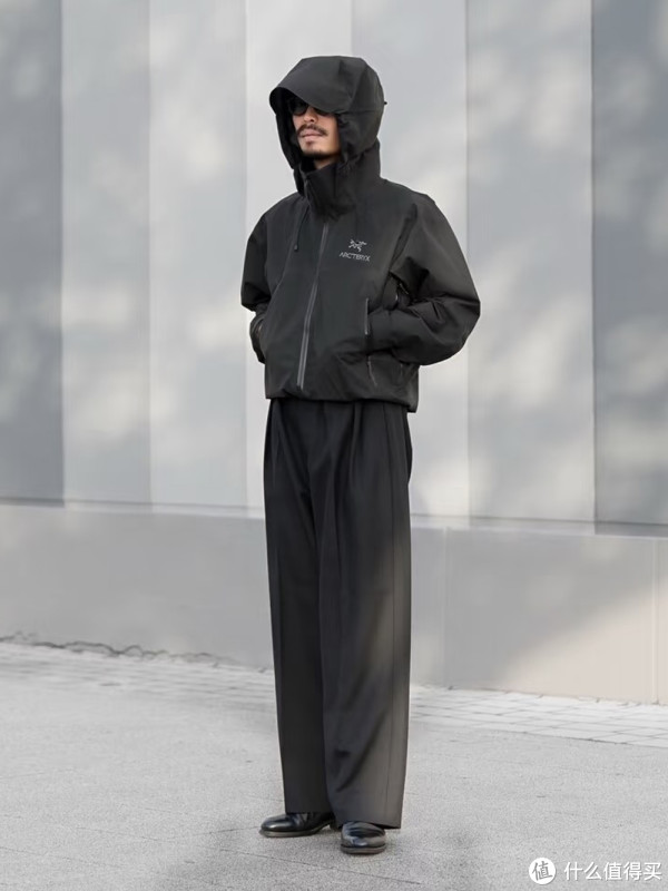 “始祖鸟冲锋衣+西裤”很常见,整体风格偏商务休闲,有种轻户外的感觉,但若是将西裤换成阔腿版型就截然不同了,时尚高级感瞬间拉满。阔腿西裤在保留商务气息的同时也增加了时髦腔调,与冲锋衣形成鲜明的风格对比感,利用风格制造矛盾冲突,从而突出造型辨识度,高级感油然而生。