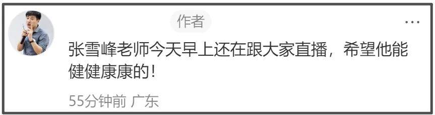 有网友晒出张雪峰最后直播画面,在去世当天上午,他还在直播。当时张雪峰在直播间的状态还是很不错的,还和直播间的家长们互动打趣,说“初中的孩子刚出门,小学的孩子在吃饭,高中的孩子在背书,他们的家长在看我。”听上去,像是早起直播。