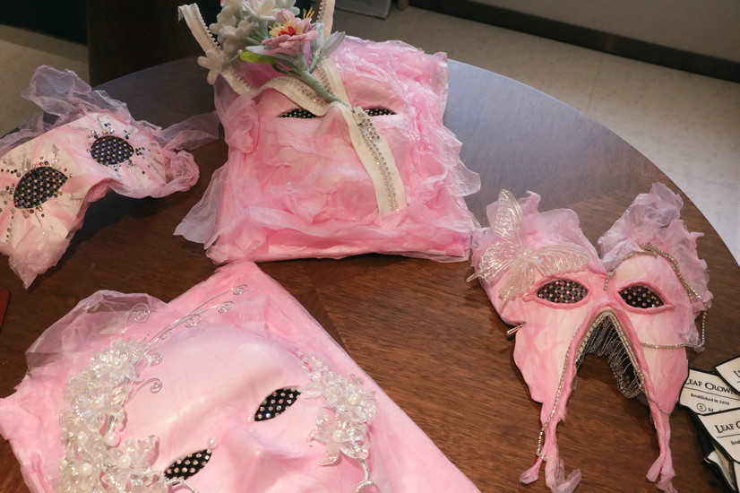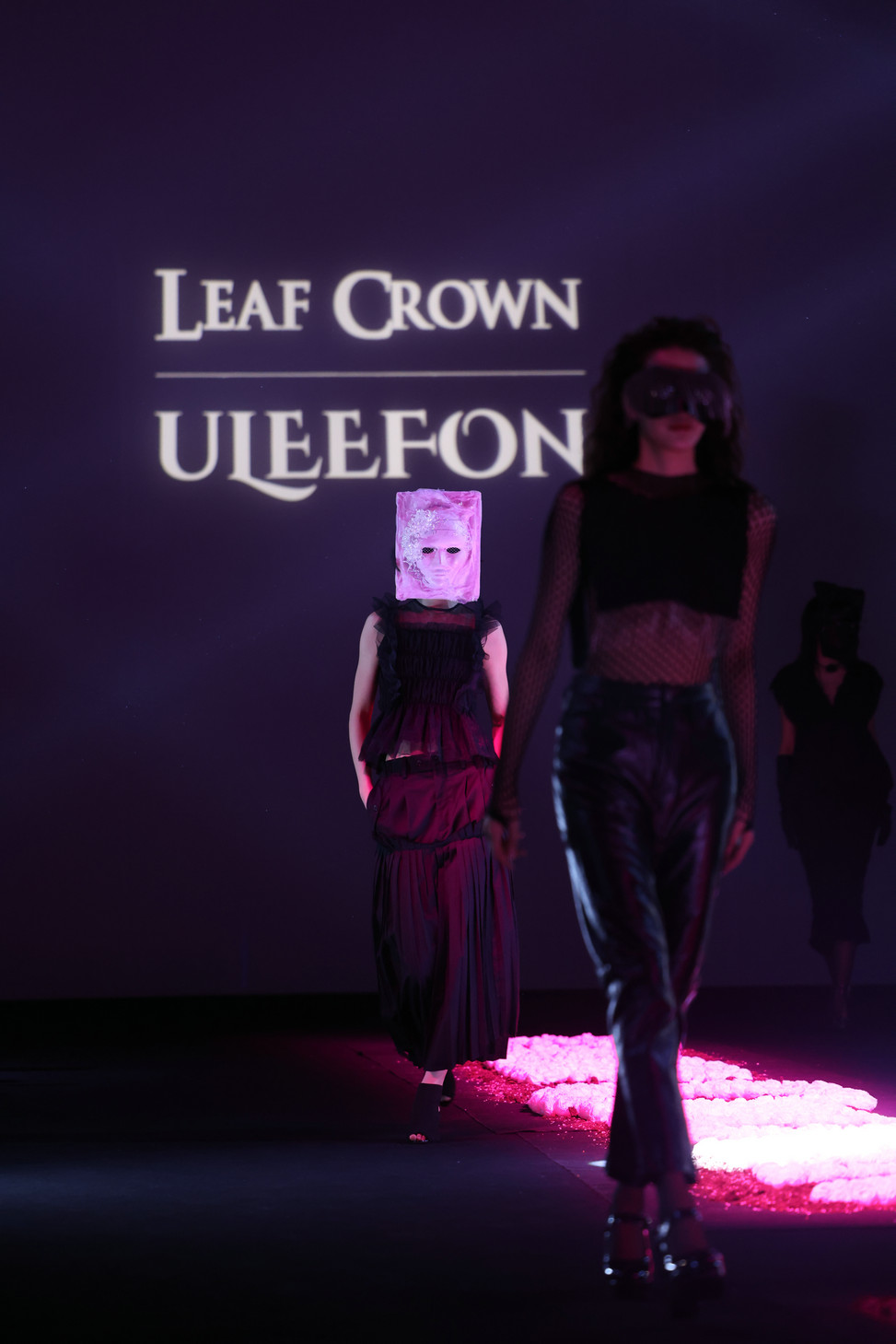 配合现场背景板上“LEAF CROWN × ULEEFON”的投影标识,以及模特面具上的粉色生物纤维装饰,粉色字母装置在黑色秀场中形成一条充满生命力的视觉动线——黑色是生命积累的厚度,粉色是破茧而出的光芒,二者递进呼应,既清晰构建出“从蛰伏到新生”的叙事线,又将“走向重生”的生命哲学与“绿色可持续”的品牌主张直观呈现在观众眼前,实现了时尚美学与环保理念的完美共生。