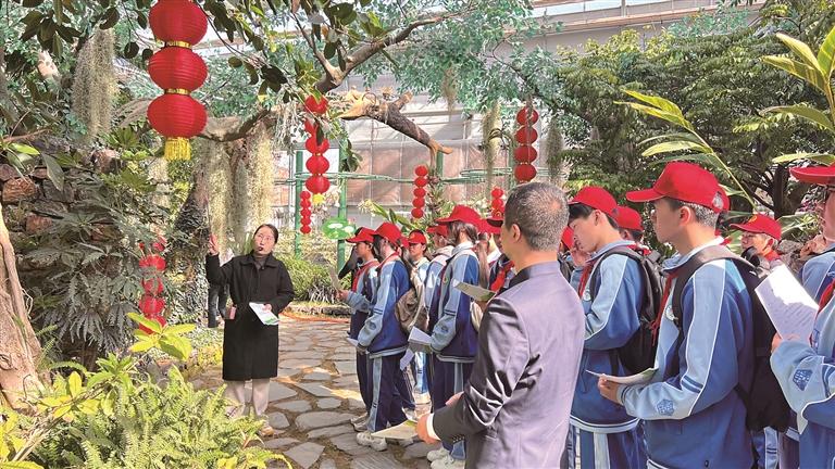 活动现场,伴着春风与笑语,同学们分成两组,有序走进雨林馆与药草馆,开启沉浸式科普探索之旅。在绿意盎然的雨林空间,大家观察热带植物形态、了解生态循环奥秘;在飘着药香的药草馆里,辨识药材、学习中医药知识,在看、听、触、思的过程中,收获自然知识、科学素养与实践能力。市第二中学学生程鑫表示:“这里有北方看不到的花草,还有珍贵的药草、热带雨林的奇观,每一片叶子、每一朵花都蕴藏着大自然的秘密。我在这个过程中认识了很多植物,学习了中医药知识,还制作了植物标本。此次活动让我们走出课堂、与自然对话,收获了一段奇妙的旅程。”
