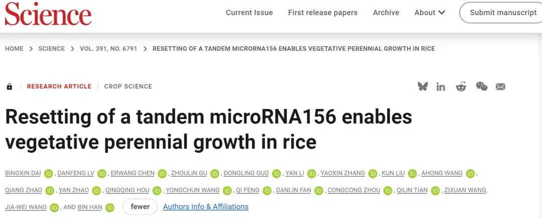 2026年3月20日,中国科学院分子植物科学卓越创新中心,植物性状形成与塑造全国重点实验室韩斌院士团队和植物高效碳汇重点实验室(中国科学院)王佳伟研究员团队,以封面形式在国际权威学术期刊Science上发表题为“Resetting of a tandem microRNA156 enables vegetative perennial growth in rice”的论文。该研究首次克隆了决定野生稻多年生生活习性的关键基因EBT1,并阐明了该基因座位表达模式的改变是水稻在驯化过程中由多年生向一年生转变的关键。